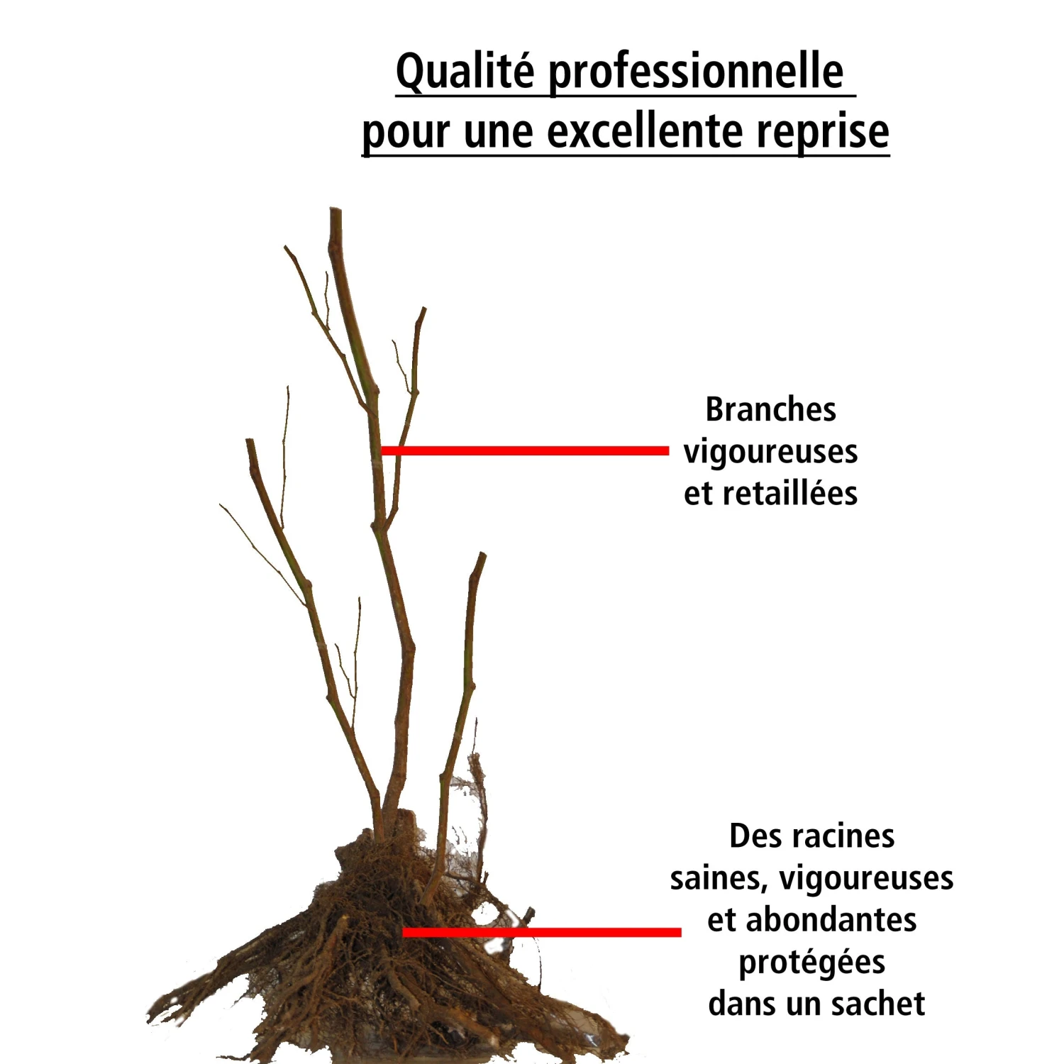 Les Rubus Idaeus Versailles, plus communément appelés Framboisiers remontants Versailles, sont une variété remontante de la famille des Rosaceae. Originaires d’Europe et d’Asie tempérée, ils sont relativement communs. De plus, leur culture ne présente pas de difficulté particulière, d’autant que les arbustes qu’ils forment n’ont pas d’épines, ce qui facilite la récolte. Ce type de framboisiers a le mérite de produire des fruits rouges de belle taille, d’une dizaine de grammes environ, au goût prononcé. Après que leurs bourgeons soient éclos en de petites fleurs blanches, la fructification s’étale sur la période estivale, de juin à mi-octobre, avec une baisse de rendement au milieu de l’été. En somme, les framboisiers remontants Versailles apportent de la couleur au jardin, du haut de leur 1,50 m à maturité.