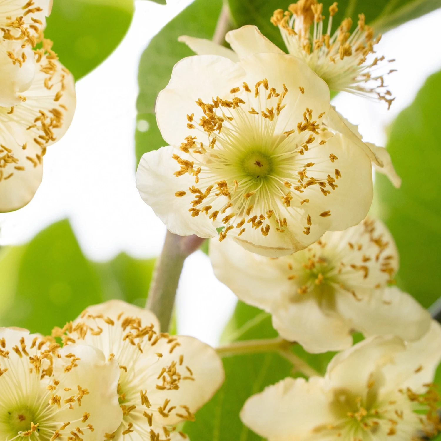 Membre de la famille des actinidiacées qui comprend 3 genres et environ 360 espèces, le kiwi mâle est l’une des plantes les plus populaires. Il pousse en formant une liane ligneuse et sinueuse et peut vivre jusqu’à 50 ans. Son feuillage est caduc et sa croissance est modérée à rapide. Dans de bonnes conditions de culture, il peut atteindre plus de 9 m à maturité. Les fleurs du kiwi mâle (Actinidia deliciosa mâle) sont de couleur blanche et deviennent ensuite jaune pâle. Elles comportent de 5 à 6 pétales. Alors qu’elles apparaissent aussi bien sur les kiwis mal que les kiwis femelles, les deux variétés possèdent de nombreuses étamines. À la différence du kiwi femelle, les fleurs du kiwi mâle sont chargées en pollen. Il existe des cultivars de kiwis mâles avec des fleurs autofécondes et bisexuelles, plus fragiles lorsque les températures de la belle saison atteignent des sommets. Cette variété de kiwi a tendance à fleurir en abondance tous les deux ans, ce qui affecte la production de fruits.